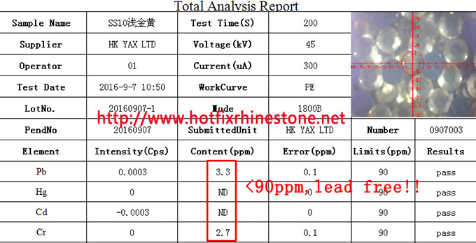 Therefore, the lead free rhinestone is defined that the content of Pb, Cd, Cr, Ni, Hg and so on the harmful heavy metals is less than 90ppm.