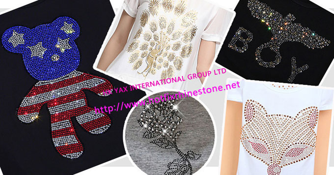 The factory of garment/shoes/hats will iron rhinestones motif on the fabric after they get the hot fix transfer motif designs which finished layout already .The rhinestones glue will melt and then back to solidified by the way of heat transfer/iron on, so that the crystal can be stick on the fabric or leather.