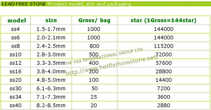 The packing of hot fix lead free rhinestone,China A rhinestone,China B rhinestone and hot fix studs are bulk pack.